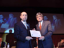 Newton Paulo Freire Filho - presidente da Prodesp, recebe das mãos de Julio Semeghini - deputado federal, o Prêmio Cidadânia, promovido pelo Anuário Informática Hoje em 08/10/2001. |